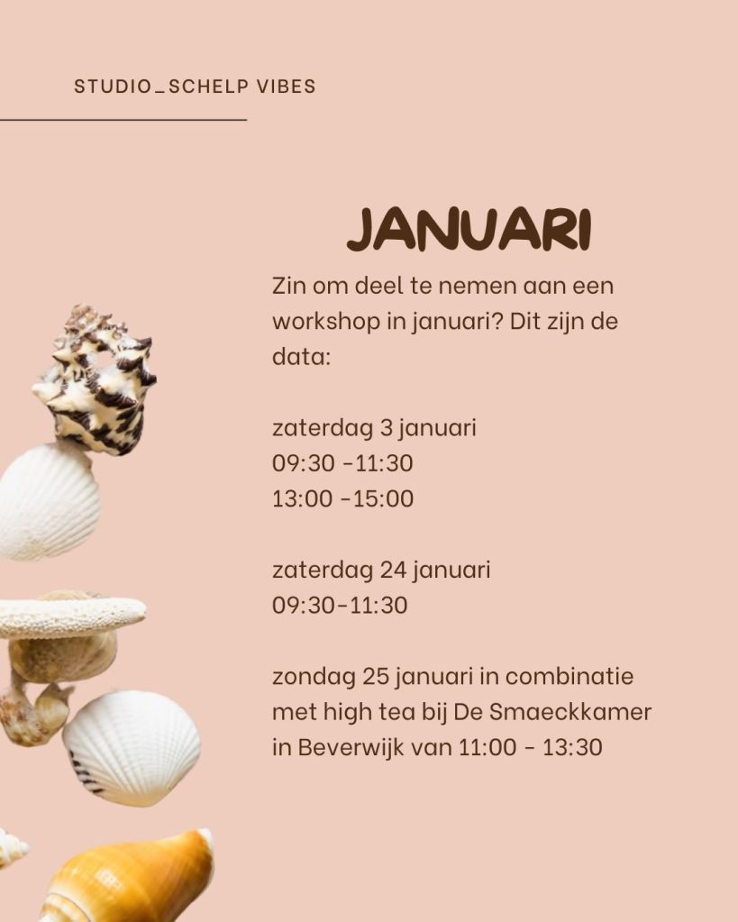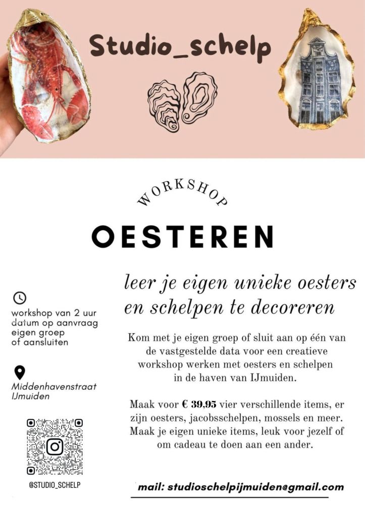 Sfeerimpressie atelier De workshop vindt plaats in het atelier van Studio_schelp in de haven van IJmuiden, een fijne lichte plek op één hoog. Na aankomst en een korte uitleg is er de ruimte om 2 uur aan de slag te gaan met de verschillende technieken om een schelp te decoreren. Na afloop is er de…
