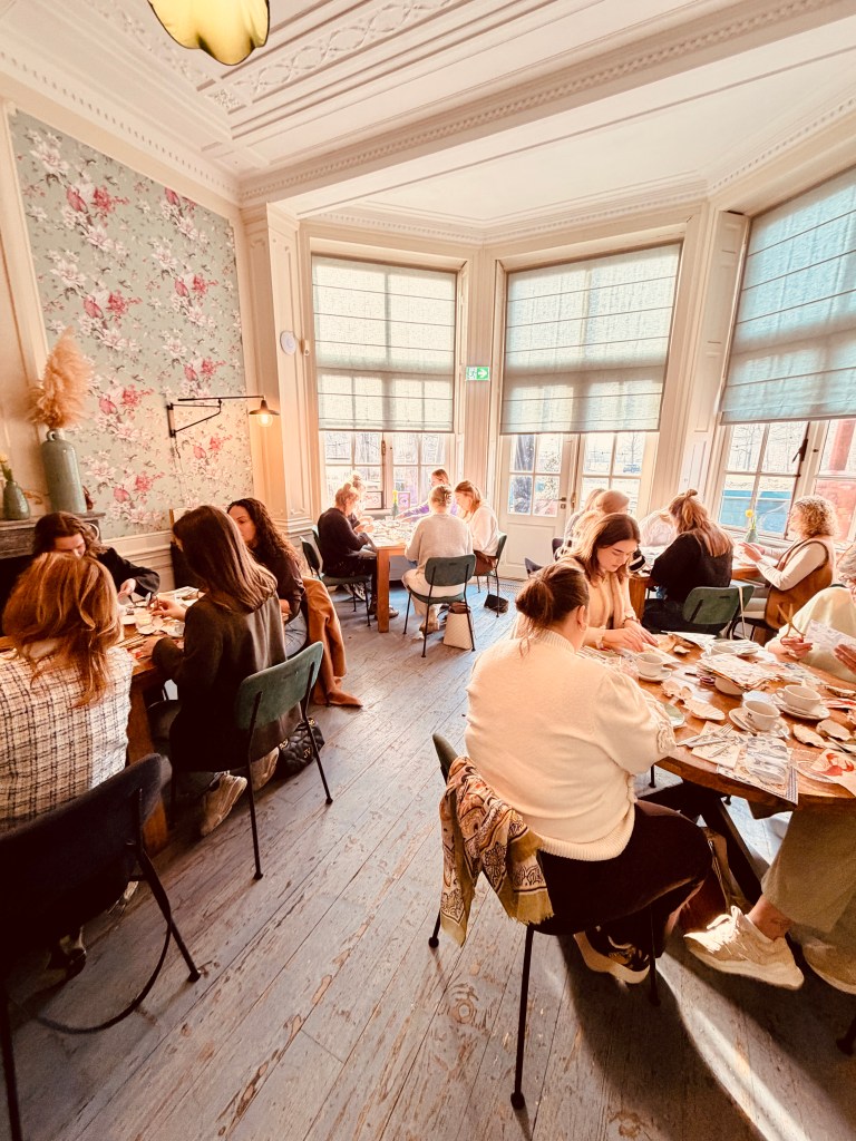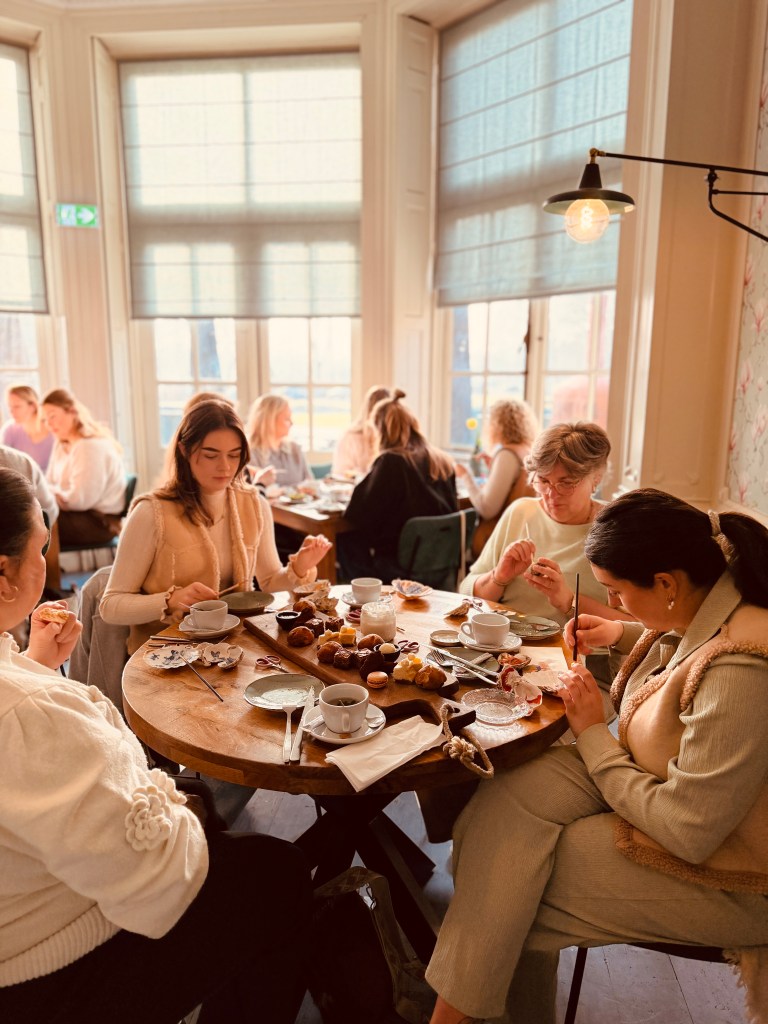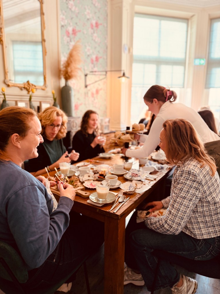 Tijdens de workshop werden de deelnemers verwend met een heerlijke High Tea verzorgd door het team van De Smaeckkamer. Van smaakvolle hartige hapjes tot zoete lekkernijen — de presentatie was mooi, de smaken bijzonder en de selectie thee was zorgvuldig gekozen. Tussendoor werden er vrolijke gesprekken gevoerd, nieuwe contacten gelegd en spontaan ideeën uitgewisseld over kunst, het creatieve proces en wat ons allemaal inspireert in het dagelijks leven. Het voelde letterlijk als een samenkomst van gelijkgestemden: creatief, nieuwsgierig en met zin in verbinding.